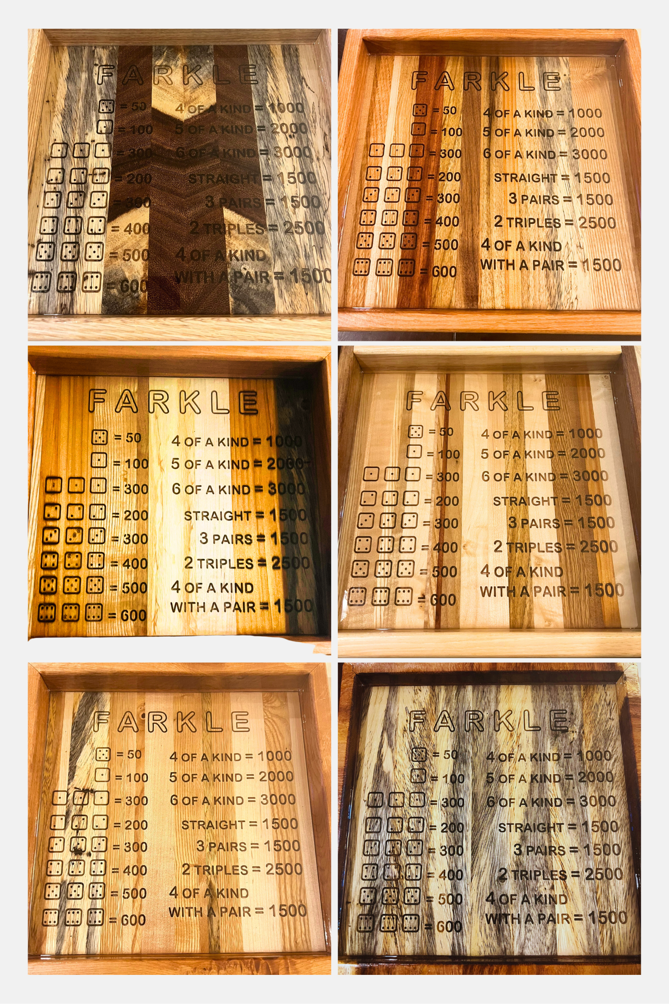 Elevate your game night with our beautifully handcrafted Farkle board, designed for both fun and functionality. Each board is meticulously carved with the official Farkle scoring rules directly on the surface, ensuring you never lose track of the game. The play area is surrounded by a sturdy raised wall to keep dice securely in place during enthusiastic rolls. Coated with a high-quality, glossy epoxy finish, the play surface is smooth, durable, and easy to clean, making it perfect for countless rounds of Farkle with family and friends.